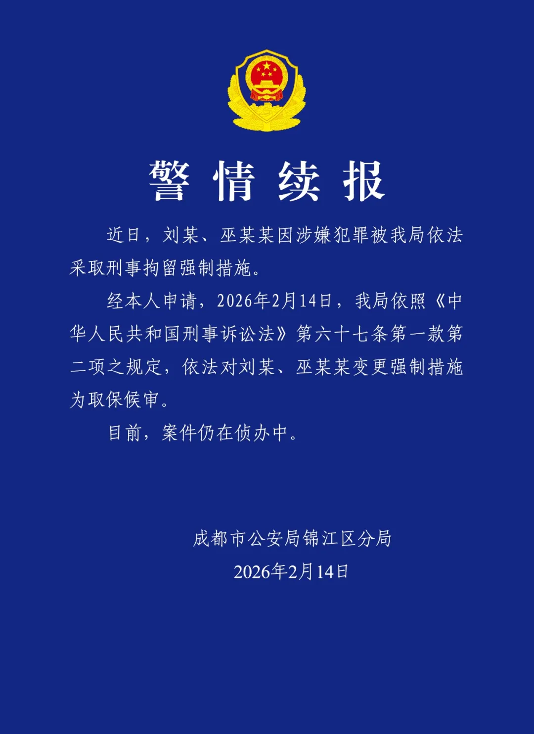 2026年2月14日,成都市公安局锦江区分局发布一则警情续报: