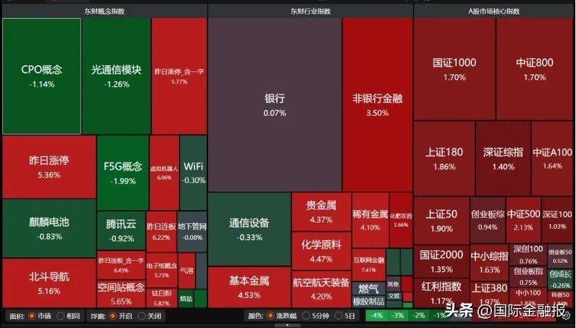 盘面上,CPO概念、光通信模块、F5G概念、通信设备等板块下跌,其余板块多数收涨。非银金融、贵金属、化学原料、基本金属、航空航天设备、北斗导航、虚拟机器人等板块均表现不错。