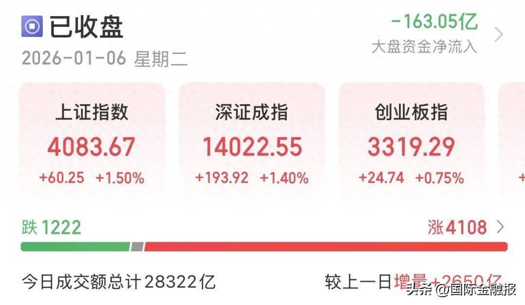 1月6日,A股续写“开门红”,沪指实现13连阳,日成交突破2.8万亿元,指数、板块、个股全线飘红,4108只个股收红最新配资平台,有色金属、电子、计算机、基础化工、国防军工领涨。